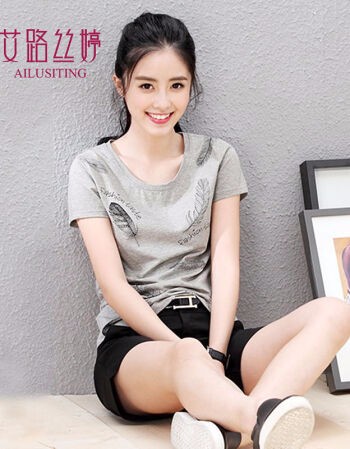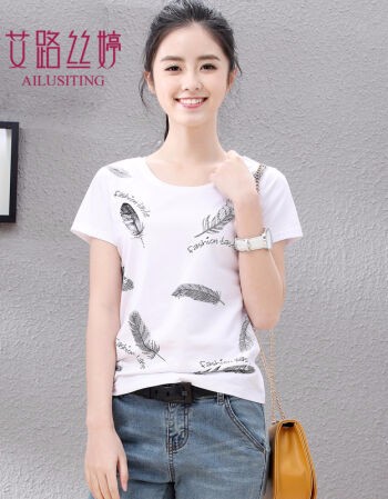 艾路丝婷2017夏装新款女装修身圆领体恤羽毛印花短袖棉T恤女3380 羽毛图案(灰色) M